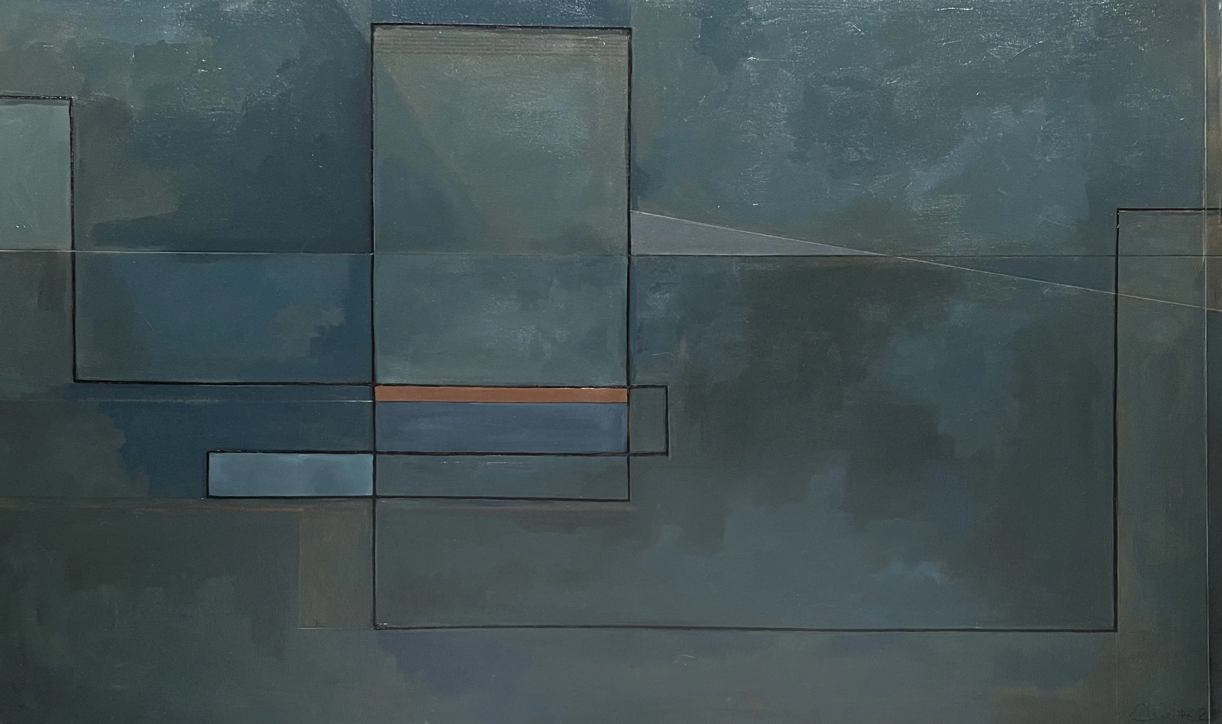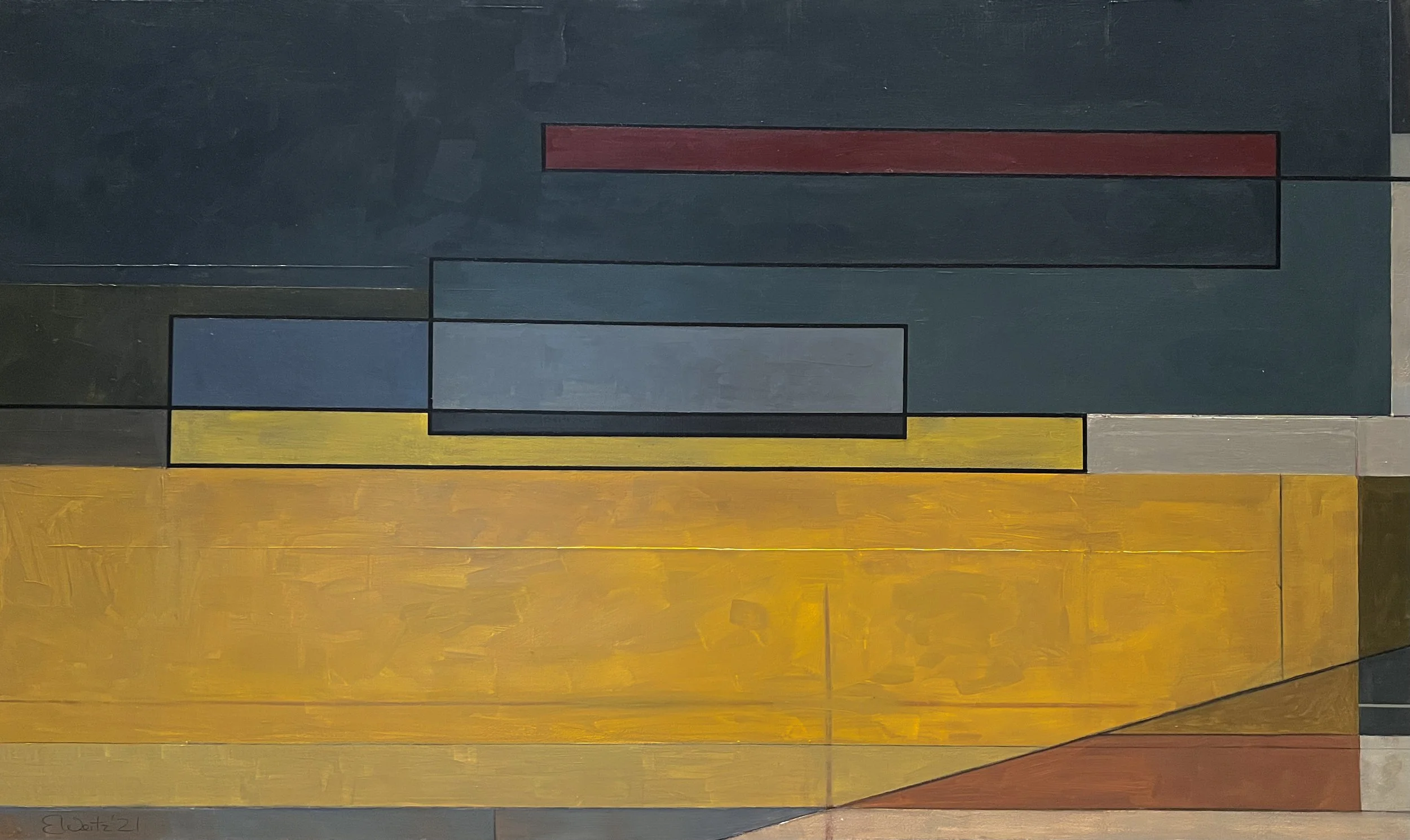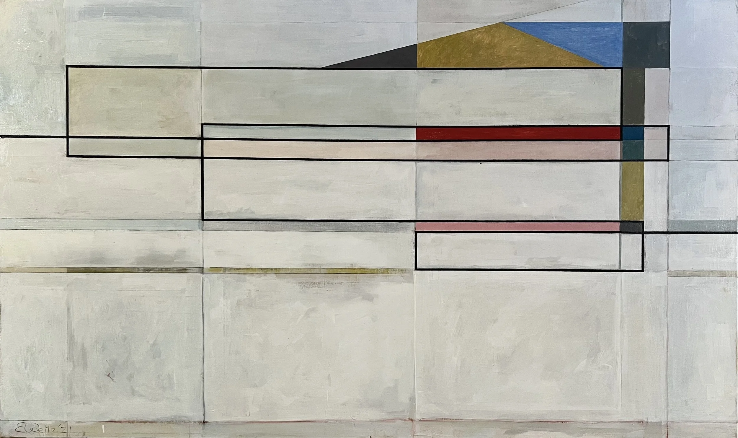 A few years ago, I embarked on a relationship with a simple motif: the line. The Line is a study of the journey of a continuous rule as it flows into a composition, meanders with right angles, and exits—only to reappear in the next. This ongoing movement explores how the line interacts with surrounding shapes, tonalities, and textures across a series of 36” x 60” canvas environments. Through all of it, the line is the elixir.