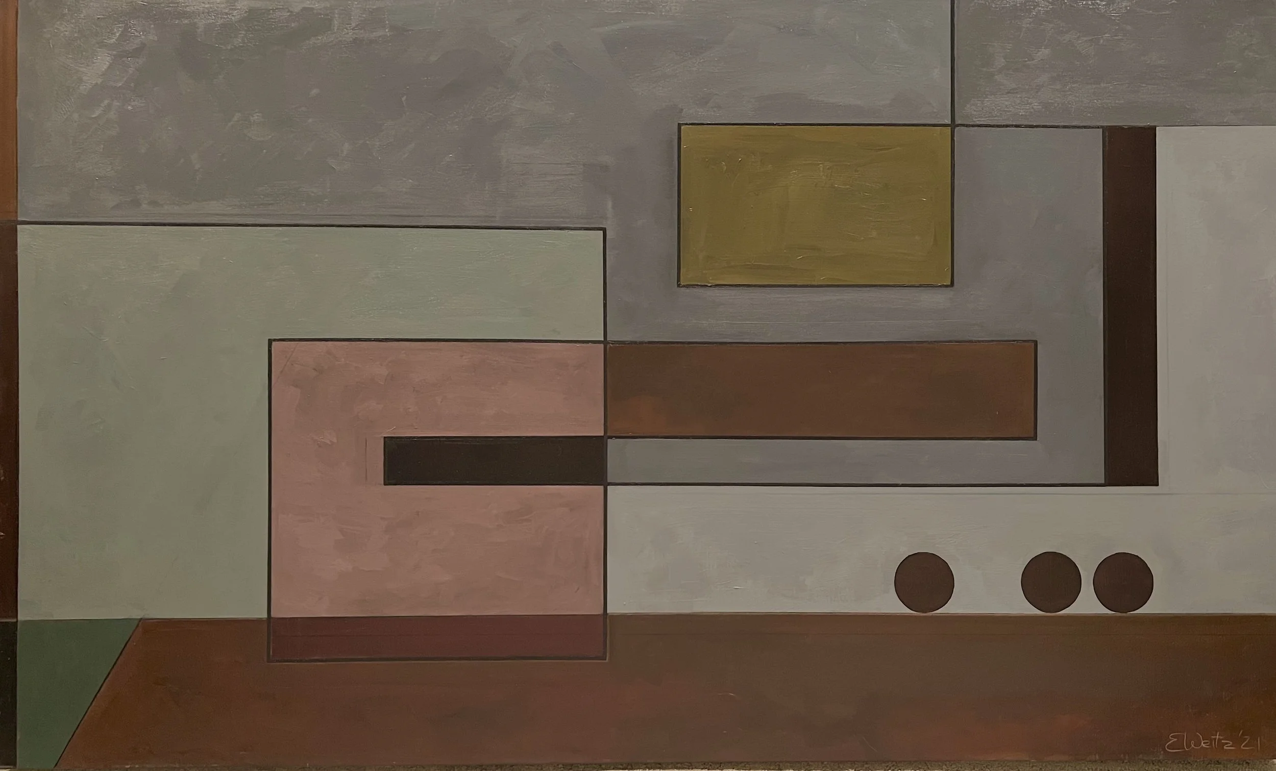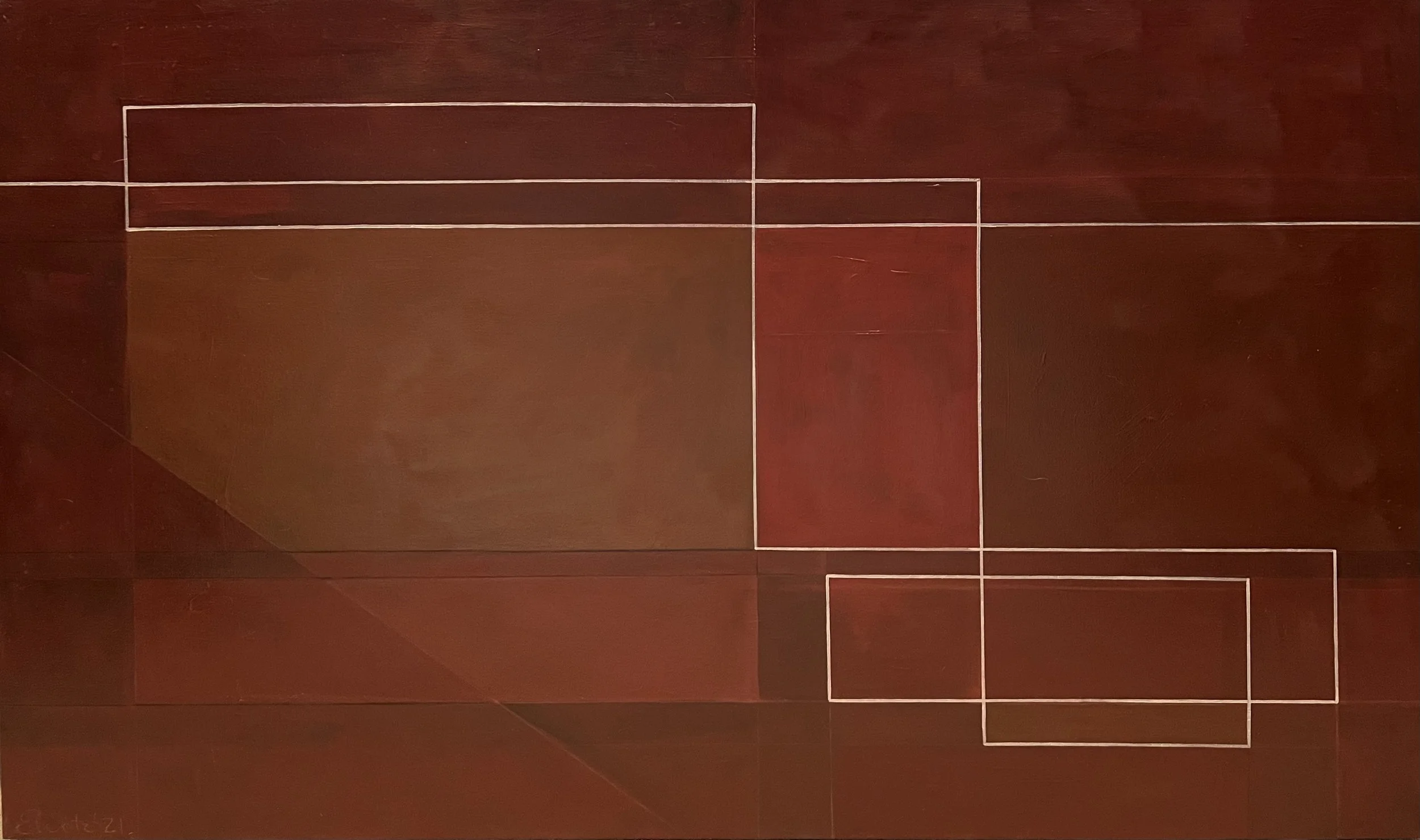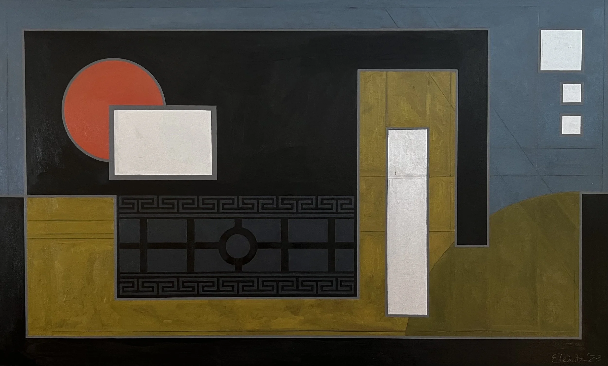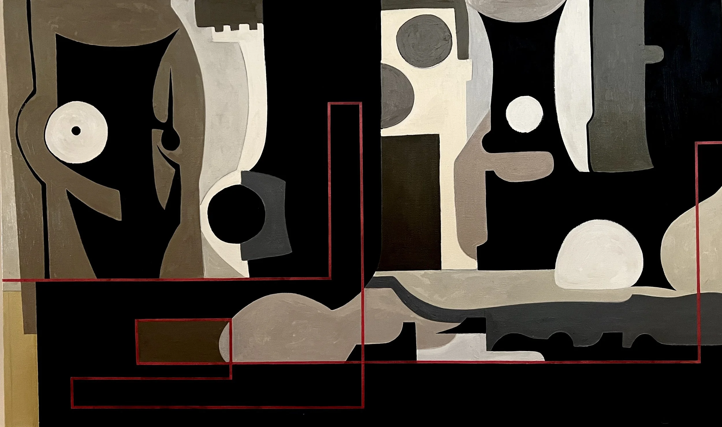 A few years ago, I embarked on a relationship with a simple motif: the line. The Line is a study of the journey of a continuous rule as it flows into a composition, meanders with right angles, and exits—only to reappear in the next. This ongoing movement explores how the line interacts with surrounding shapes, tonalities, and textures across a series of 36” x 60” canvas environments. Through all of it, the line is the elixir.