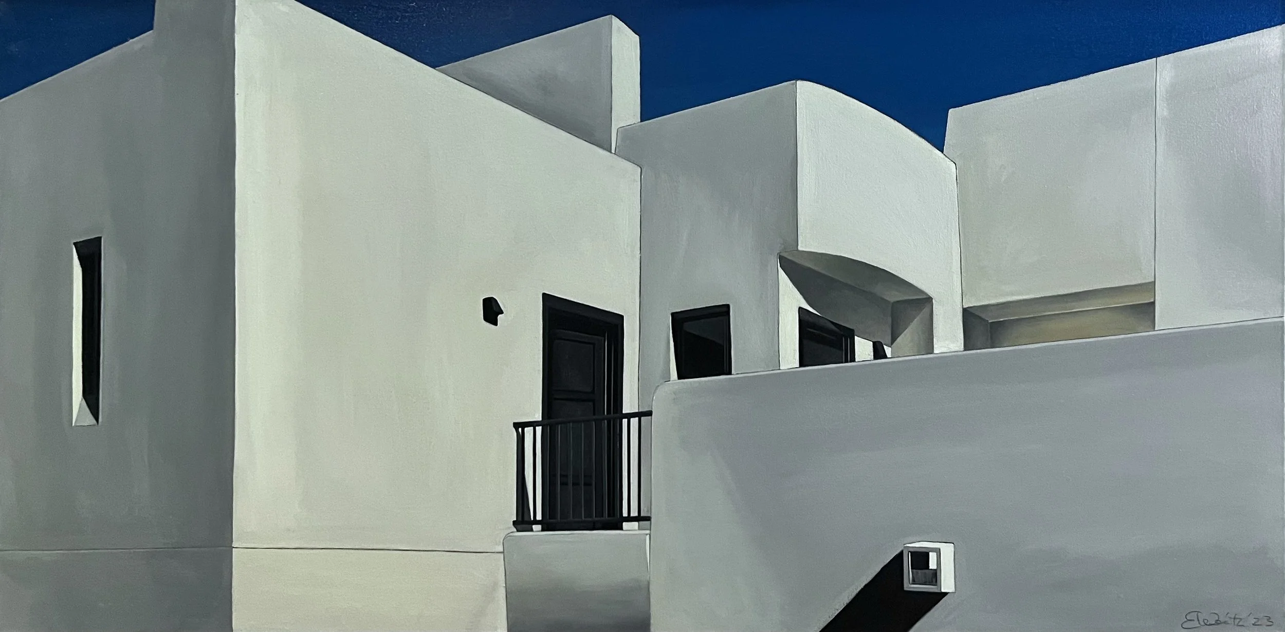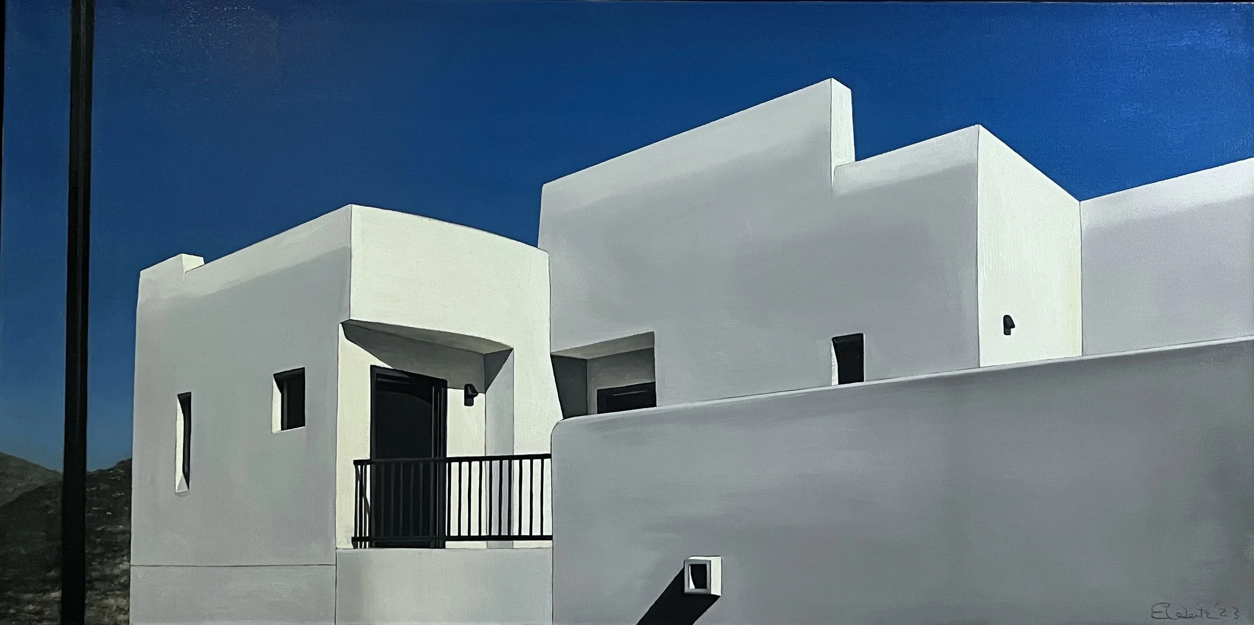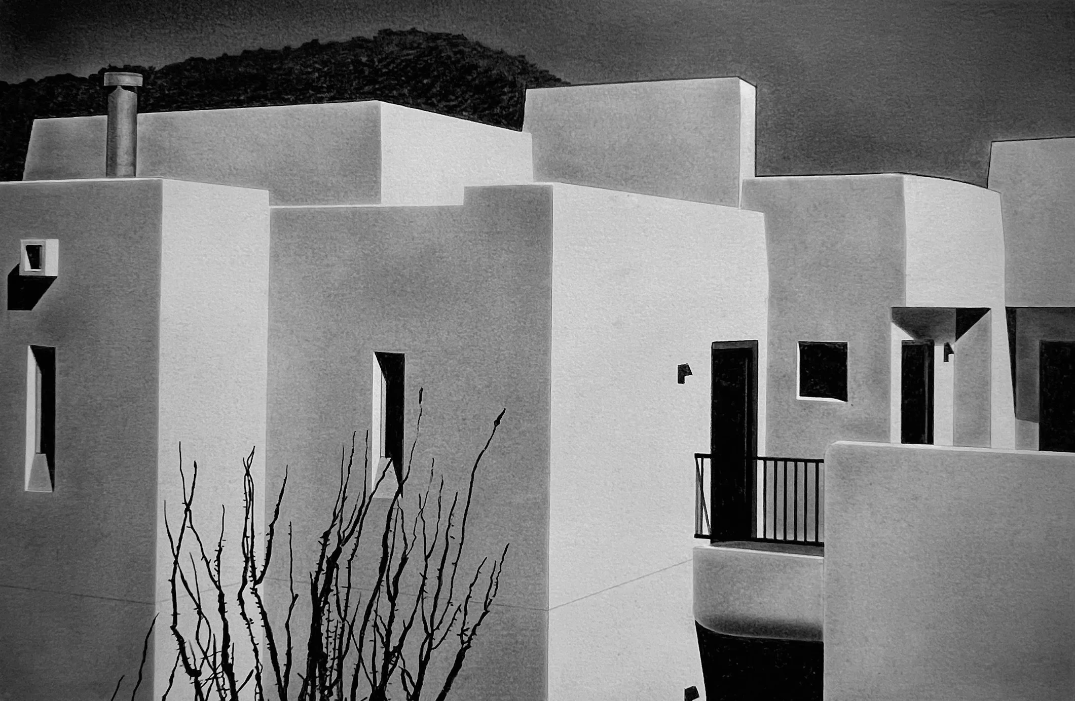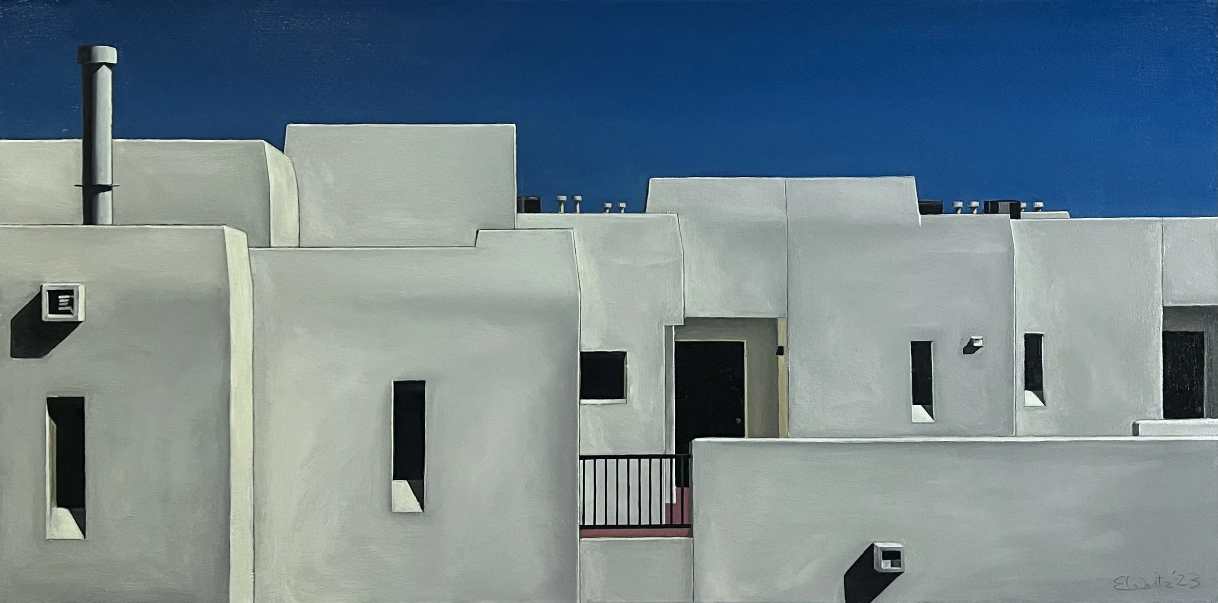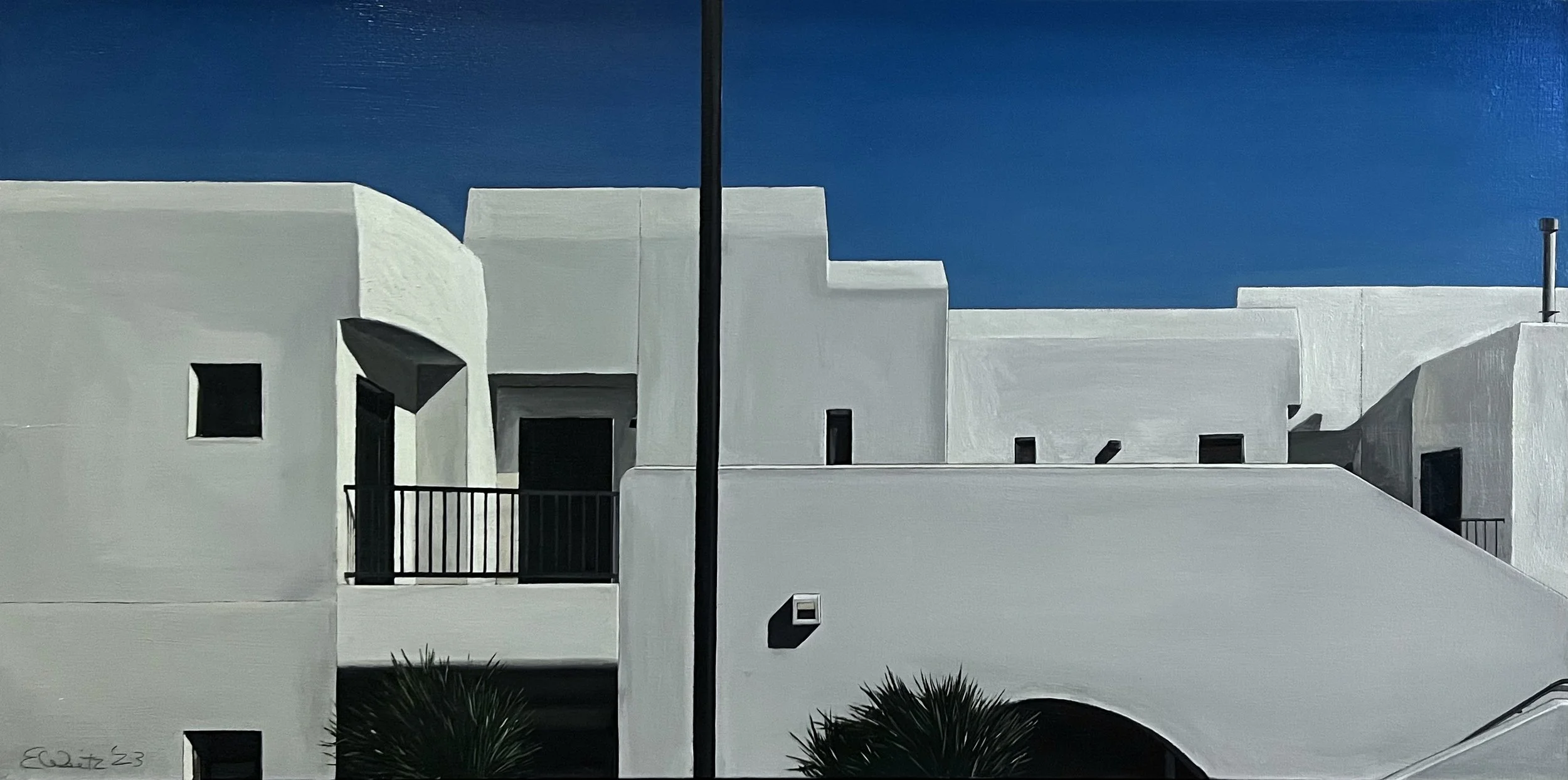 The Adero Hotel is the subject of an intimate series of work by Edwin Carter Weitz. It’s an in-depth study of the visual power that the southwestern sunshine has upon the architectural style of the region. The clean-lined drawings and intense oils capture the beauty and elegance of the interactions between geometric shapes and tonal variances through sensitive shifts in perspective.