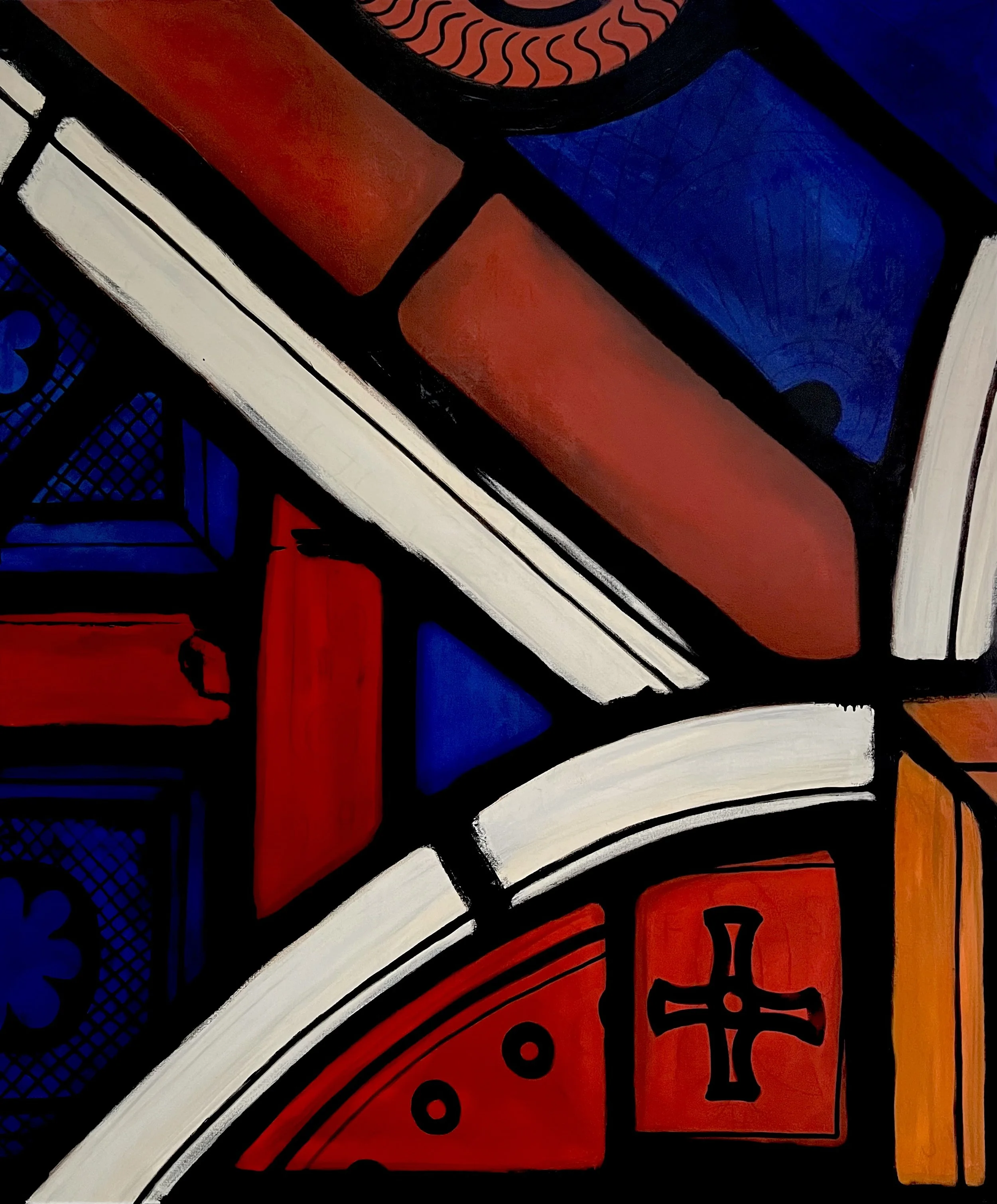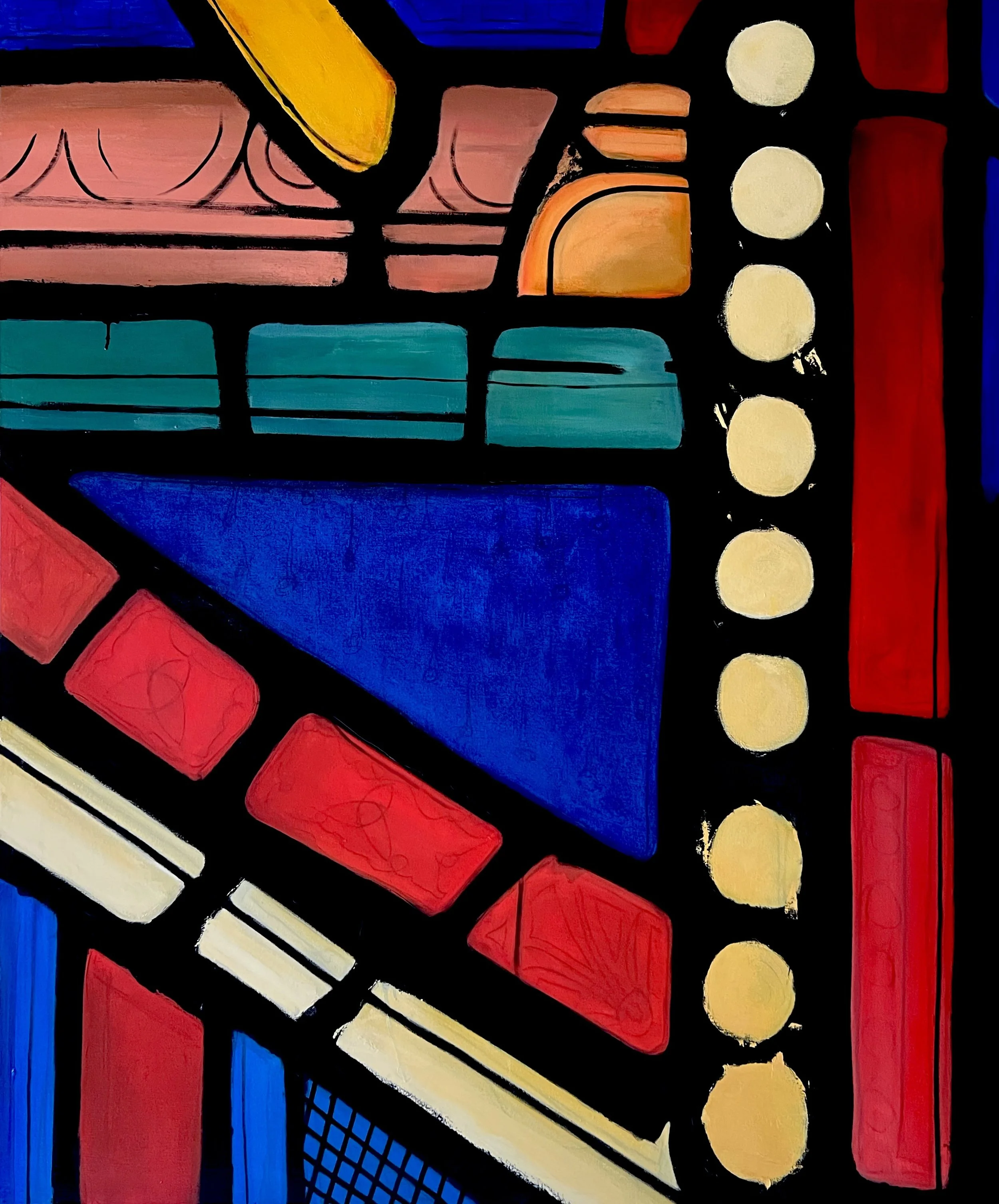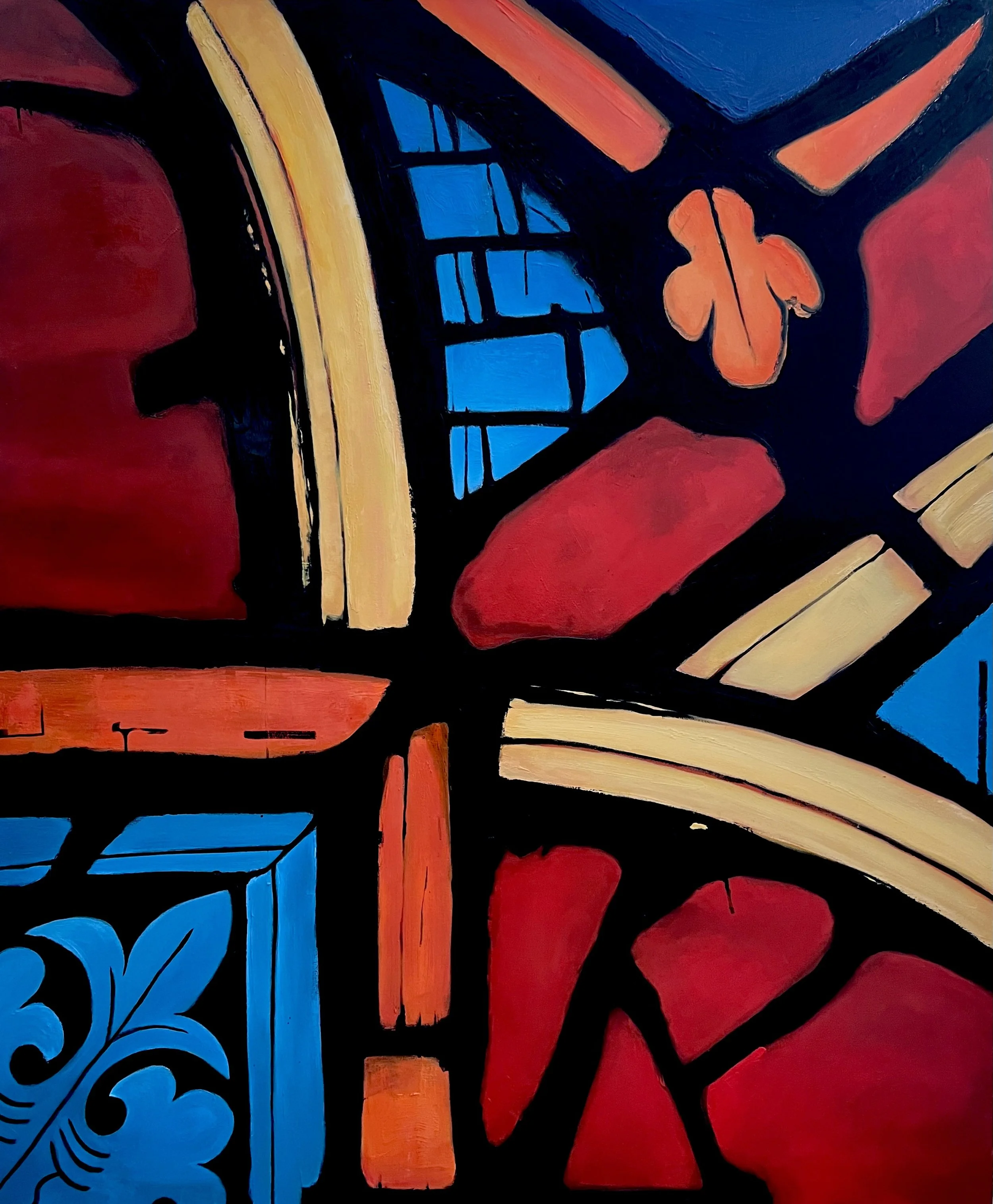Patches of vivid color float amid a black framework and loosely interact with each other like puzzle pieces not yet joined. There is a sensuality of light that comes through in the abstract assemblage of colored forms that at times feel very primitive. The pictures are intimate and intense. The series got its name because the basic structure of these oil paintings is reminiscent of light streaming through stained glass windows.